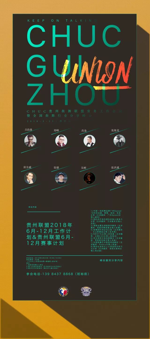 中国舞蹈家协会街舞委员会贵州联盟常务会议&全国街舞行业分享峰会将于2018年5月23日在贵阳举办。将邀请CHUC广东联盟常务副主任郑峰,CHUC贵州联盟常务副主任肖枭,CHUC甘肃联盟常务副主任吕浩渤,凯里灵舞竞壹主理人张健、CHUC贵州联盟副主任张洪禹,云南KGS主理人张海龙,Remix主理人吴迪,贵阳沃麦特主理人班全威作为峰会分享嘉宾。与CHUC贵州联盟下的机构开展高效的交流,CHUC贵州联盟2018年6月—12月工作计划与赛事计划也将在会议中公布。