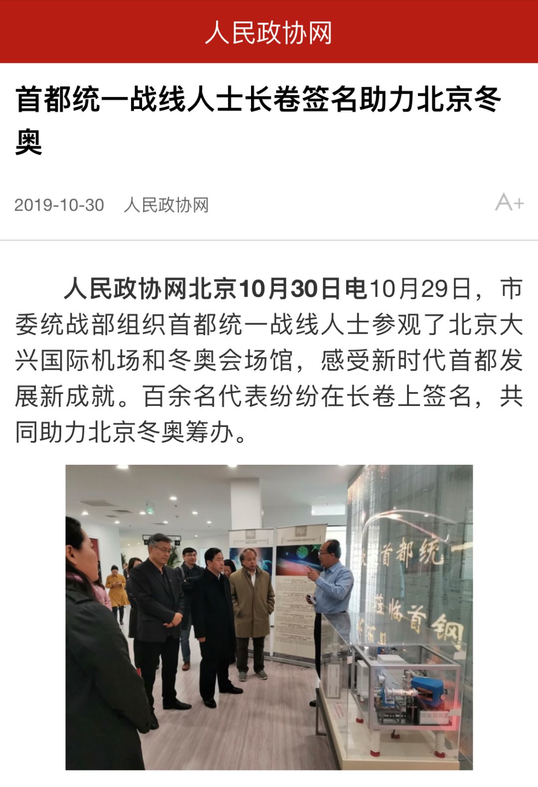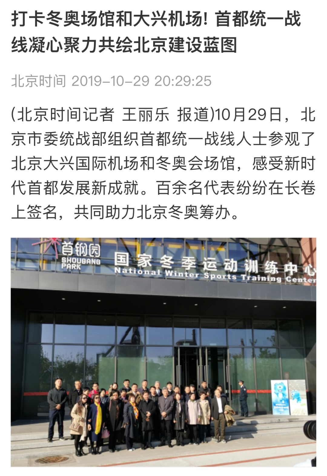参观冬奥会场馆是首都统一战线庆祝新中国成立70周年主题教育活动的重要内容之一。首都各民主党派人士、民族宗教界人士、港澳台人士、非公经济人士、无党派人士、新阶层人士、在京侨界人士约100名代表,参观了国家体育总局冬季运动管理中心冰壶首钢训练基地、北京冬奥会和冬残奥会展示中心,并开展“首都统一战线助力北京冬奥长卷签名”活动。