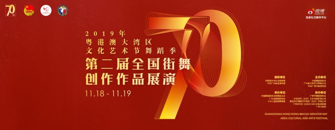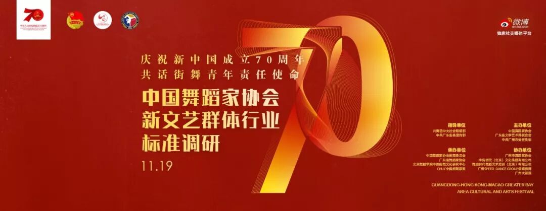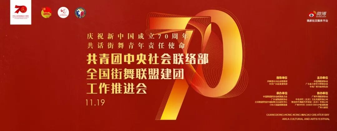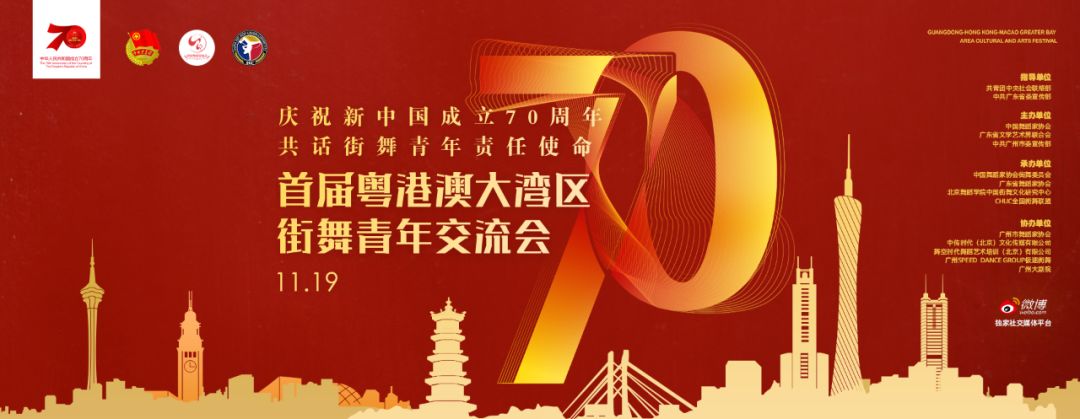 11月19日,由共青团中央社会联络部、中共广东省委宣传部指导;中国舞蹈家协会、广东省文学艺术界联合会、中共广州市委宣传部主办;中国舞蹈家协会街舞委员会、广东省舞蹈家协会、北京舞蹈学院中国街舞文化研究中心、CHUC全国街舞联盟承办;广州市舞蹈家协会、中传时代(北京)文化传媒有限公司、舞空时代舞蹈艺术培训(北京)有限公司、广州SPEED DANCE GROUP极速街舞、广州大剧院协办;微博作为独家社交媒体平台的“庆祝新中国成立70周年·共话街舞青年责任使命——首届粤港澳大湾区街舞青年交流会”将在广州市珠江宾馆开展。