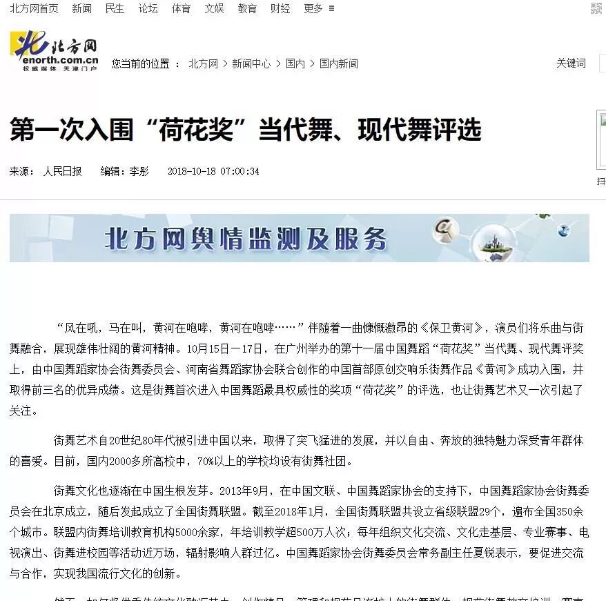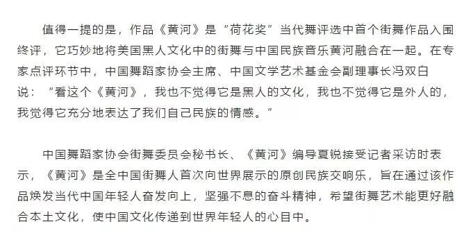 由中国舞蹈家协会街舞委员会、河南省舞蹈家协会联合出品的中国首部原创民族交响乐街舞作品《黄河》成功问鼎中国舞蹈“荷花奖”当代舞奖!