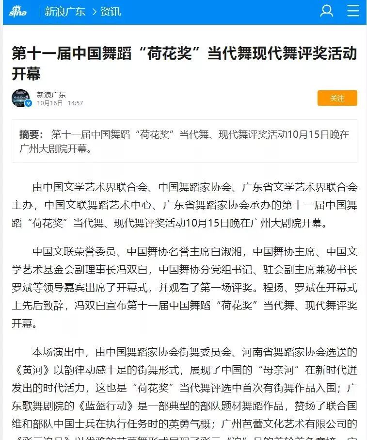 中国新闻网:《第11届中国舞蹈“荷花奖”当代舞、现代舞评奖广州启幕》