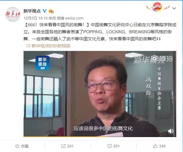 新华视点微博:【666!快来看看中国风的街舞!】中国街舞文化研究中心日前在北京舞蹈学院成立。来自全国各地的舞者表演了POPPING、LOCKING、BREAKING等风格的街舞,一些街舞还融入了武术等中国文化元素,快来看看中国风的街舞吧⬇⬇