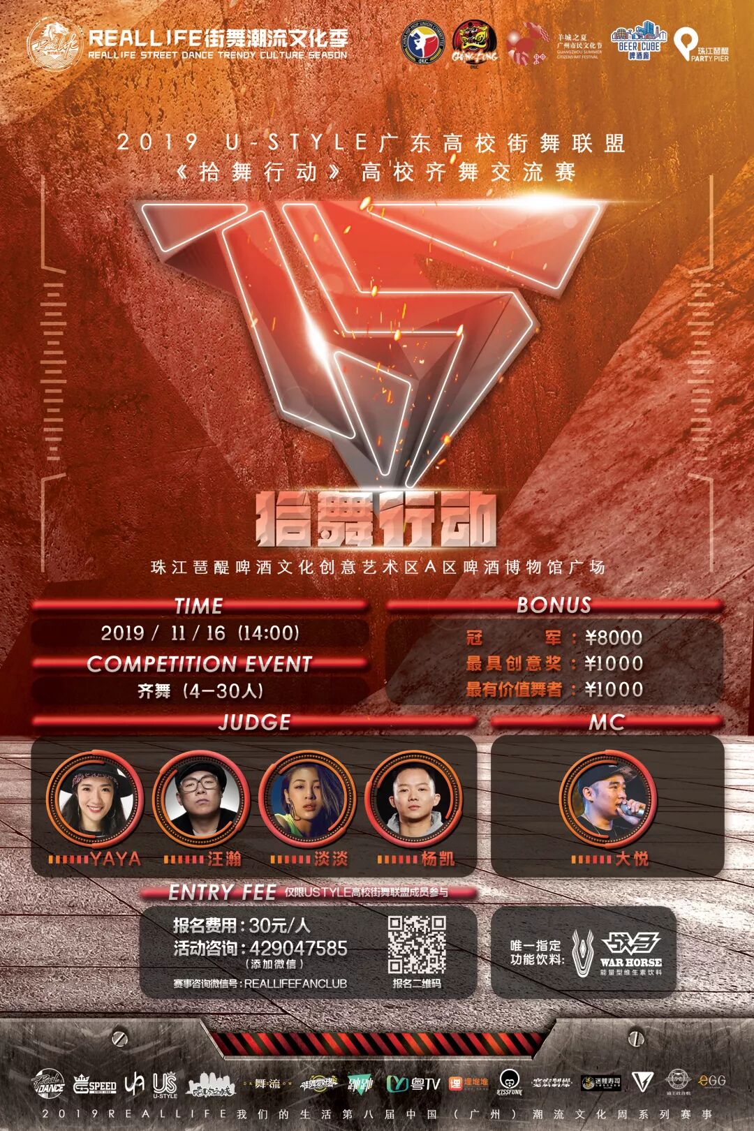 2019年,正值“中华人民共和国成立70周年”之际,在基于粤港澳大湾区建设的大背景下,由中国舞蹈家协会街舞委员会(CHUC )全国联盟的指导下的粤港澳大湾区“中国街舞”系列活动“将从2019年11月持续到2020年1月,包括“第二届全国街舞编创作品展演”、“Real Dance广州国际街舞大赛” 、“拾舞行动高校街舞交流赛” 、“中国精品舞” 、“Dance For Funk”、“天下布舞” 、“舞林萌主少儿街舞大赛” 等一系列街舞赛事活动及潮流文化活动。邀请国内外的顶尖舞者,举办街舞展演、赛事、论坛等丰富的交流活动,通过街舞的艺术形式搭建粤港澳大湾区青年的交流平台,吸引带动香港、澳门特别行政区的街舞青年积极参与,加强促进粤港澳大湾区青少年文化交流,组织引导广大街舞青年特别是粤港澳大湾区等国家重点战略区域的新兴青年群体加强学习、提高思想,搭建文化交流学习、成长发展的舞台,帮助其更好地把握时代机遇,创造个人价值和社会价值,积极主动将理想抱负融入国家战略,在新时代积极书写新篇章。