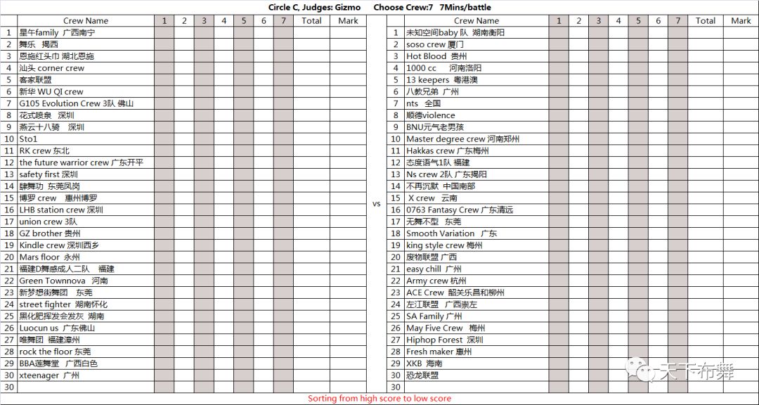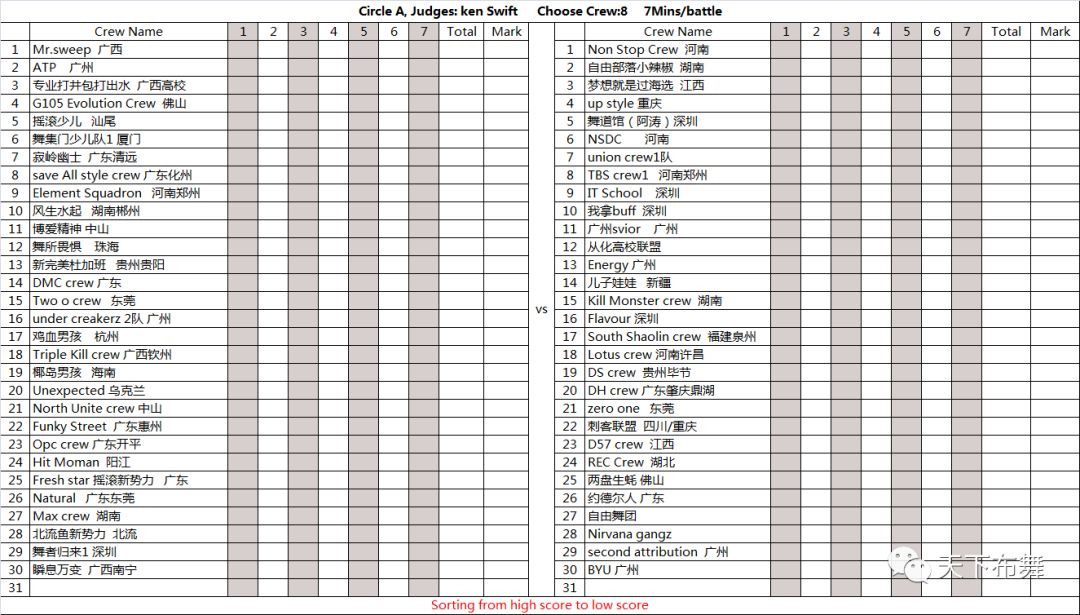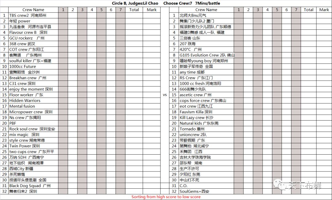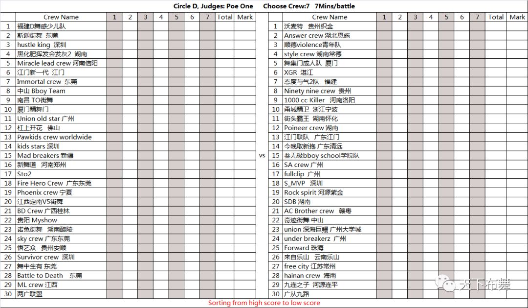 4个圈海选,每场battle 7分半钟,选出29强,按照海选分数高低分排位,与嘉宾队伍组成32强进行直接淘汰赛。