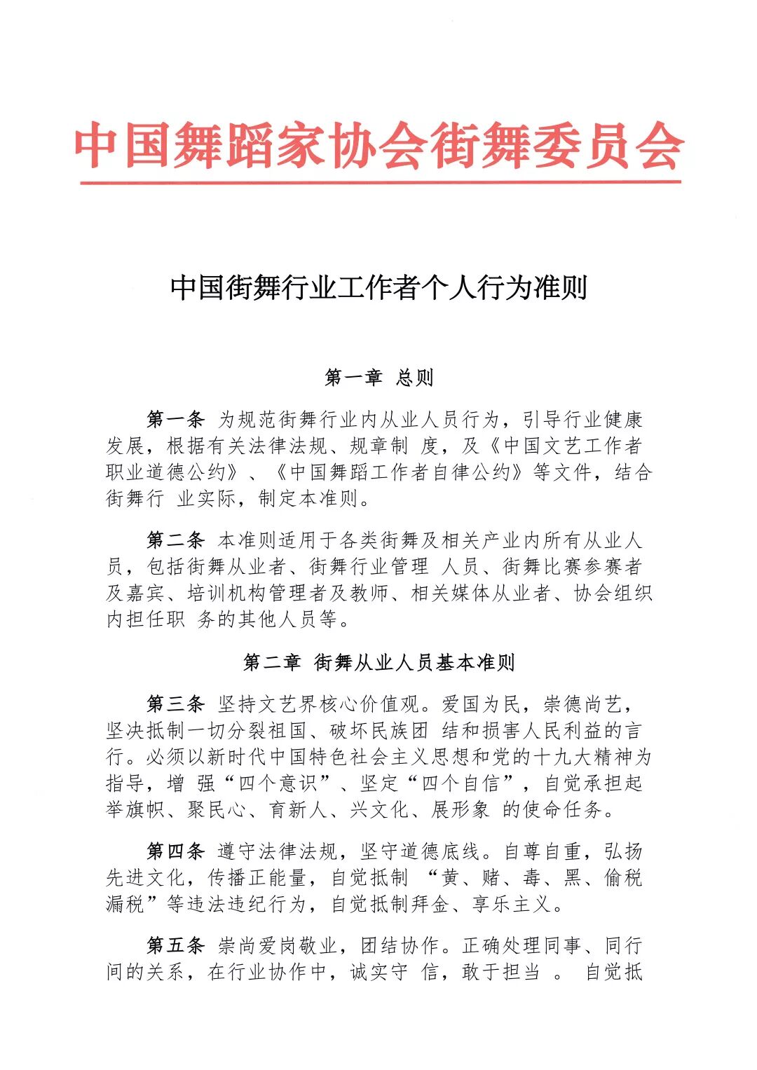 第一条 为规范街舞行业内从业人员行为,引导行业健康发展,根据有关法律法规、规章制 度,及《中国文艺工作者职业道德公约》、《中国舞蹈工作者自律公约》等文件,结合街舞行 业实际,制定本准则。