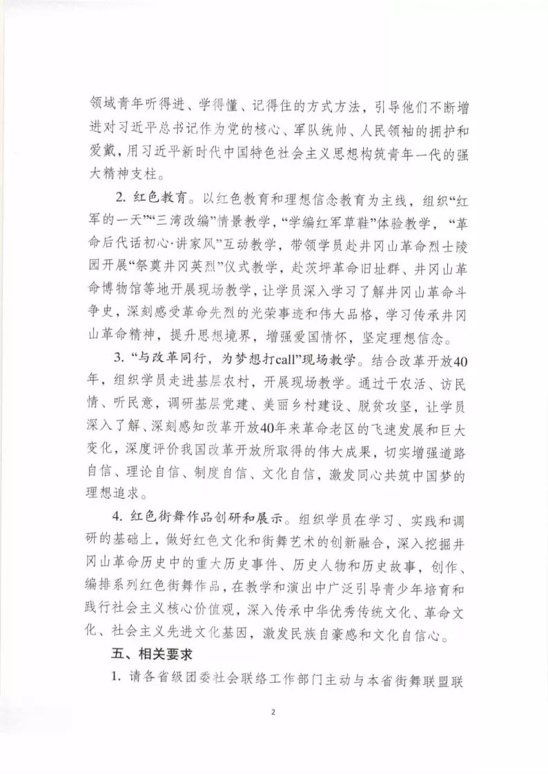 2.请各省级团委社会联络工作部门与本省街舞联盟共同策划设计相关候选作品,为培训期间即将举办的“信仰的力量”学员红色街舞作品展示活动做好准备。