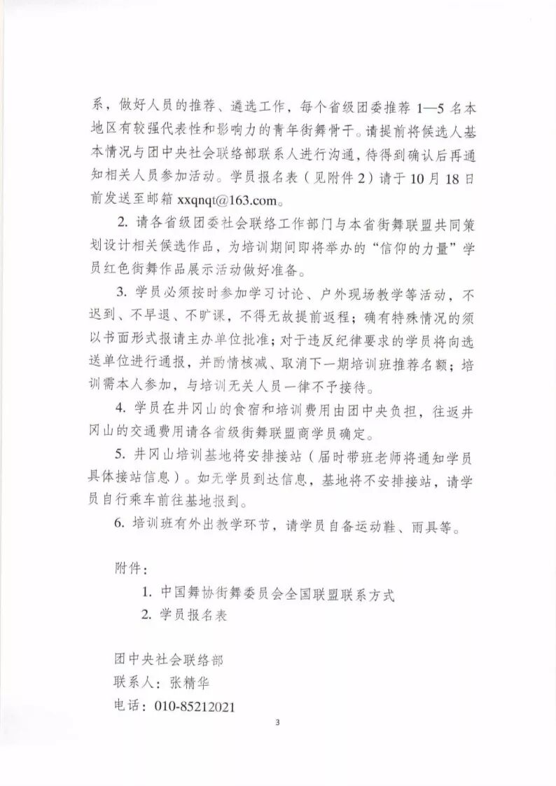1.请各省级团委社会联络工作部门主动与本省街舞联盟联系,做好人员的推荐、遴选工作,每个省级团委推荐1–5名本地区有较强代表性和影响力的青年街舞骨干。请提前将候选人基本情况与团中央社会联络部联系人进行沟通,待得到确认后再通知相关人员参加活动。学员报名表(见附件2)请于10月18日前发送至邮箱 xxqnqt@163.com。