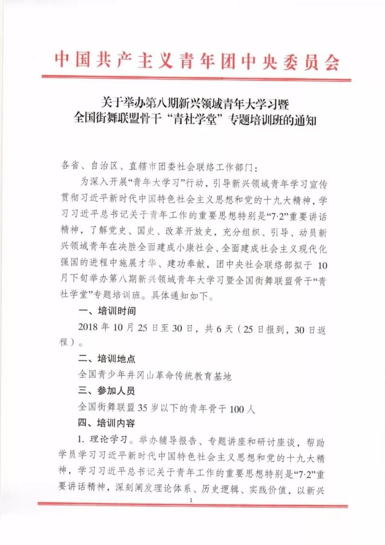 2018年10月25日至30日,为深入开展“青年大学习”行动,引导新兴领域青年学习宣传贯彻习近平新时代中国特色社会主义思想和党的十九大精神,学习习近平总书记关于青年工作的重要思想特别是“7·2”重要讲话精神,了解党史、国史、改革开放史,充分组织、引导、动员新兴领域青年在决胜全面建成小康社会、全面建成社会主义现代化强国的进程中施展才华、建功奉献,团中央社会联络部将在全国青少年井冈山革命传统教育基地举办——第八期新兴领域青年大学习暨全国街舞联盟骨干“青社学堂”专题培训班。