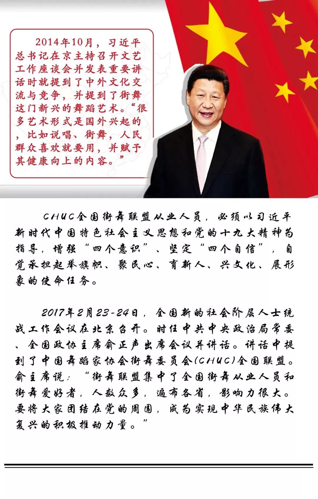 中国舞蹈家协会街舞委员会的演员主要在晚会的下篇《奋进新时代》中的第一乐章《新的天地》和第五乐章《一带一路》中参与了表演。该篇章是用新创作品展现党的十八大以来,中国进入新时代,前进脚步更矫健、社会更开放、国力更强大、人民更幸福的繁荣景象,呈现形式为情境史诗剧。节目由《新的天地》拉开下篇序幕,用情景演唱与表演的形式抒发了“我们自信、我们前行”的豪迈之情。我们的演员扮演了各行各业、各年龄层的人们以崭新而饱满的精神状态投入新生活的状态。节目《一带一路畅想曲》发出《相约世界》的邀请,开放与发展、进步与包容,正如火如荼地发生在中国的大地上。这又何尝不是街舞在中国改革开放四十年来走过的历程。