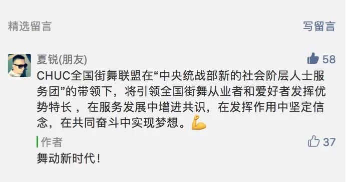 中国舞蹈家协会街舞委员会常务副主任、秘书长夏锐在官方平台留言区表示,CHUC全国街舞联盟在“中央统战部新的社会阶层人士服务团”的带领下,将引领全国街舞从业者和爱好者发挥优势特长 ,在服务发展中增进共识,在发挥作用中坚定信念,在共同奋斗中实现梦想。