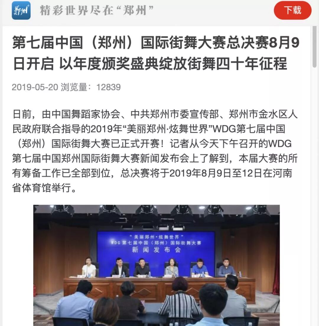 2019年5月20日下午,在郑州市人民政府新闻发布厅召开了WDG第七届中国郑州国际街舞大赛新闻发布会,本次新闻发布会出席的领导及嘉宾有:中国舞蹈家协会街舞委员会常务副主任、秘书长夏锐,中国舞蹈家协会街舞委员会副秘书长董建勇,中共郑州市委宣传部副部长王丽艳,中共金水区委常委、宣传部长杨林,新浪微博副总经理、社会责任总监董文俊,新浪微博运动运营总监赵晶,中国舞蹈家协会街舞委员会CHUC全国街舞联盟代表。
