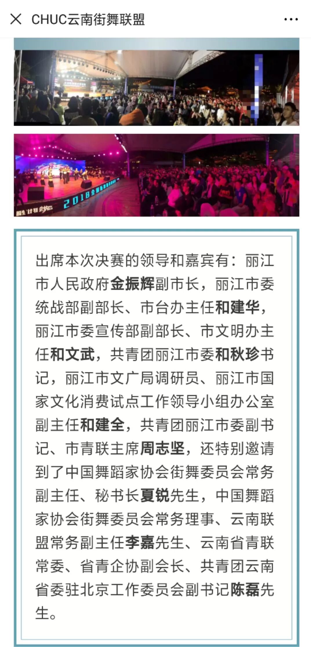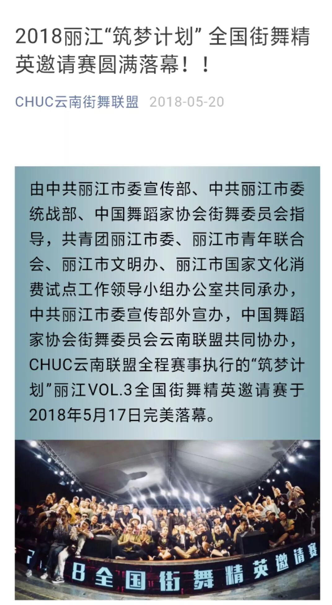 2017年5月4日,由中国舞蹈家协会街舞委员会指导;中国舞蹈家协会街舞委员会云南联盟支持;丽江市国家文化消费试点工作领导小组办公室、共青团丽江市委、古城区人民政府、丽江市青年联合会共同主办;丽江市青少年宫、大岩街道办事处、昆明嘿啪传播有限公司承办的“筑梦丽江”2017丽江街舞全国邀请赛落下帷幕。