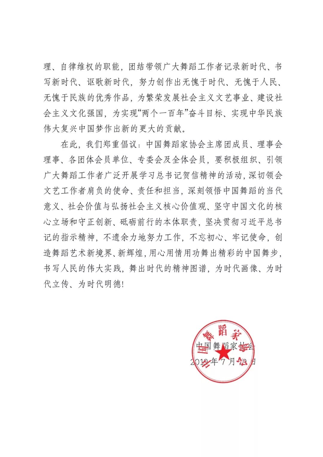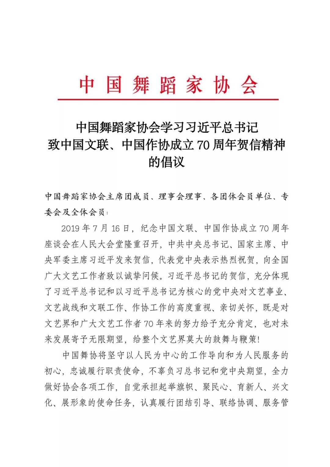中国舞蹈家协会学习习近平总书记致中国文联、中国作协成立70周年贺信精神的倡议