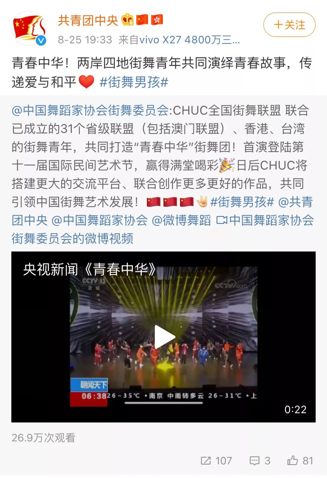 CHUC全国联盟推送来自香港、澳门、台湾和呼和浩特四地的青年舞者组成“青春中华”联合舞团,联袂为观众表演了动感十足的街舞《青春中华》,引起观众阵阵欢呼。淋漓尽致地展示了“天下一家,命运一体”的理念,让现场观众直呼过瘾。用街舞的艺术形式传递爱与和平!青春中华!