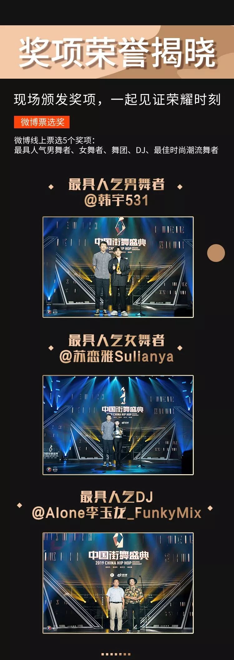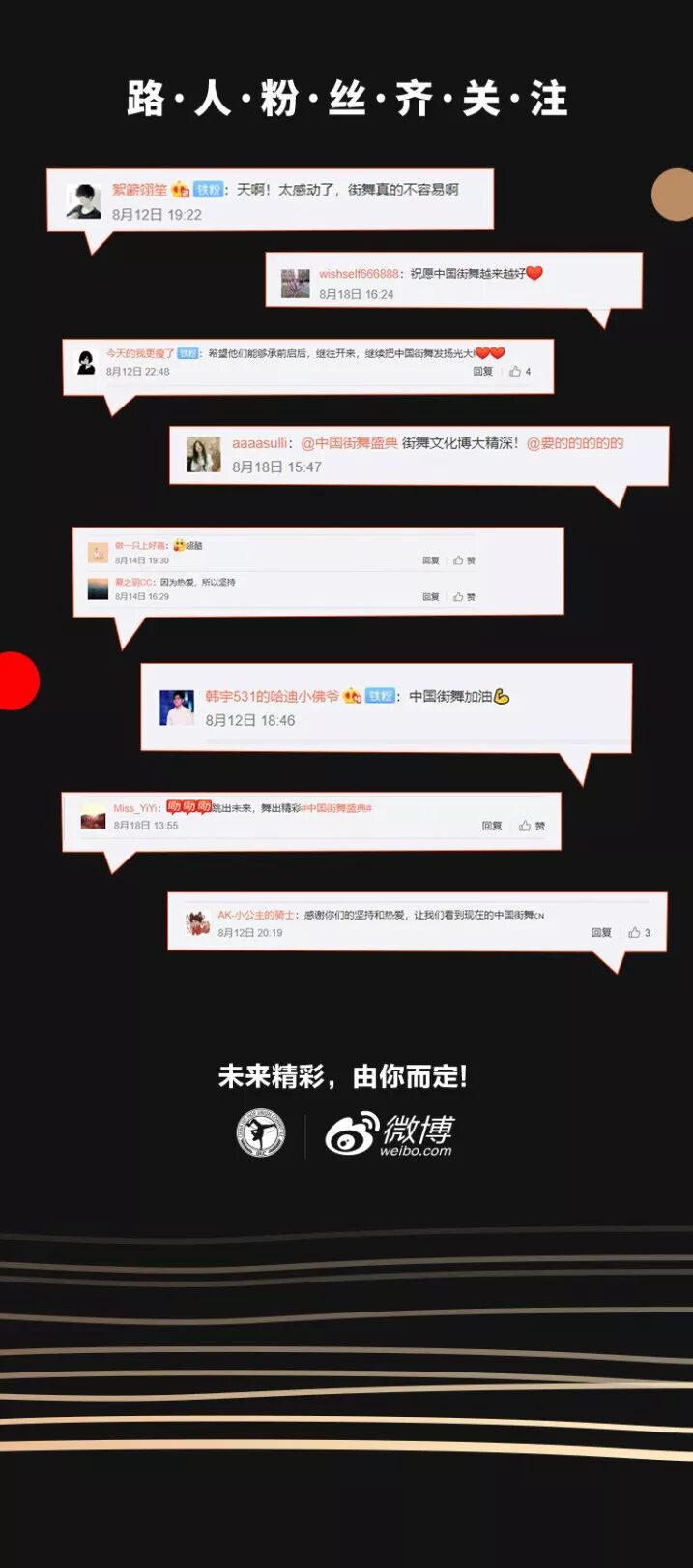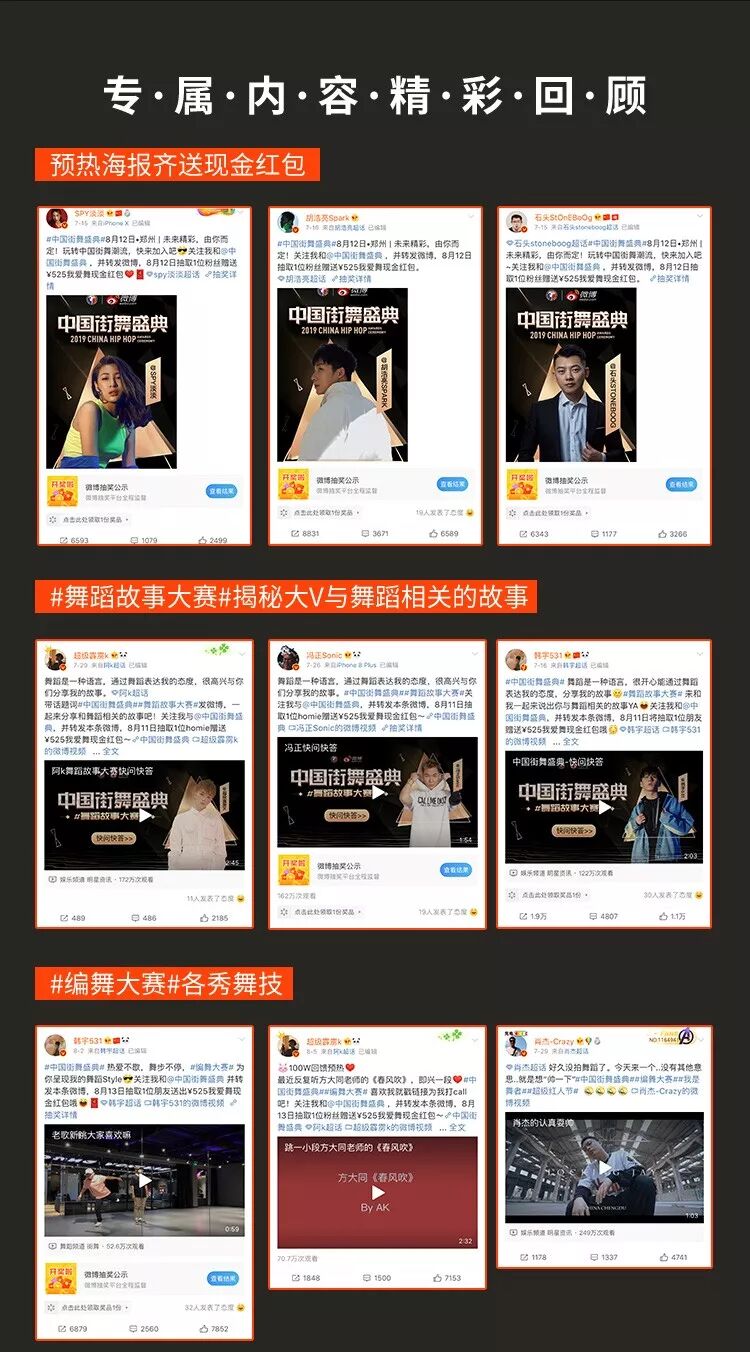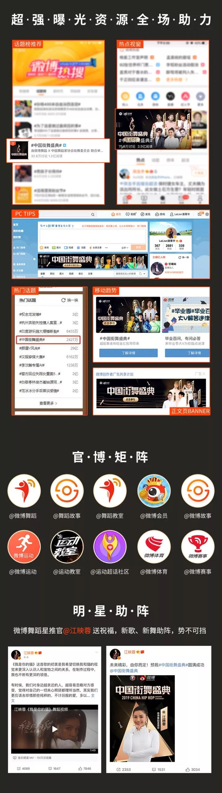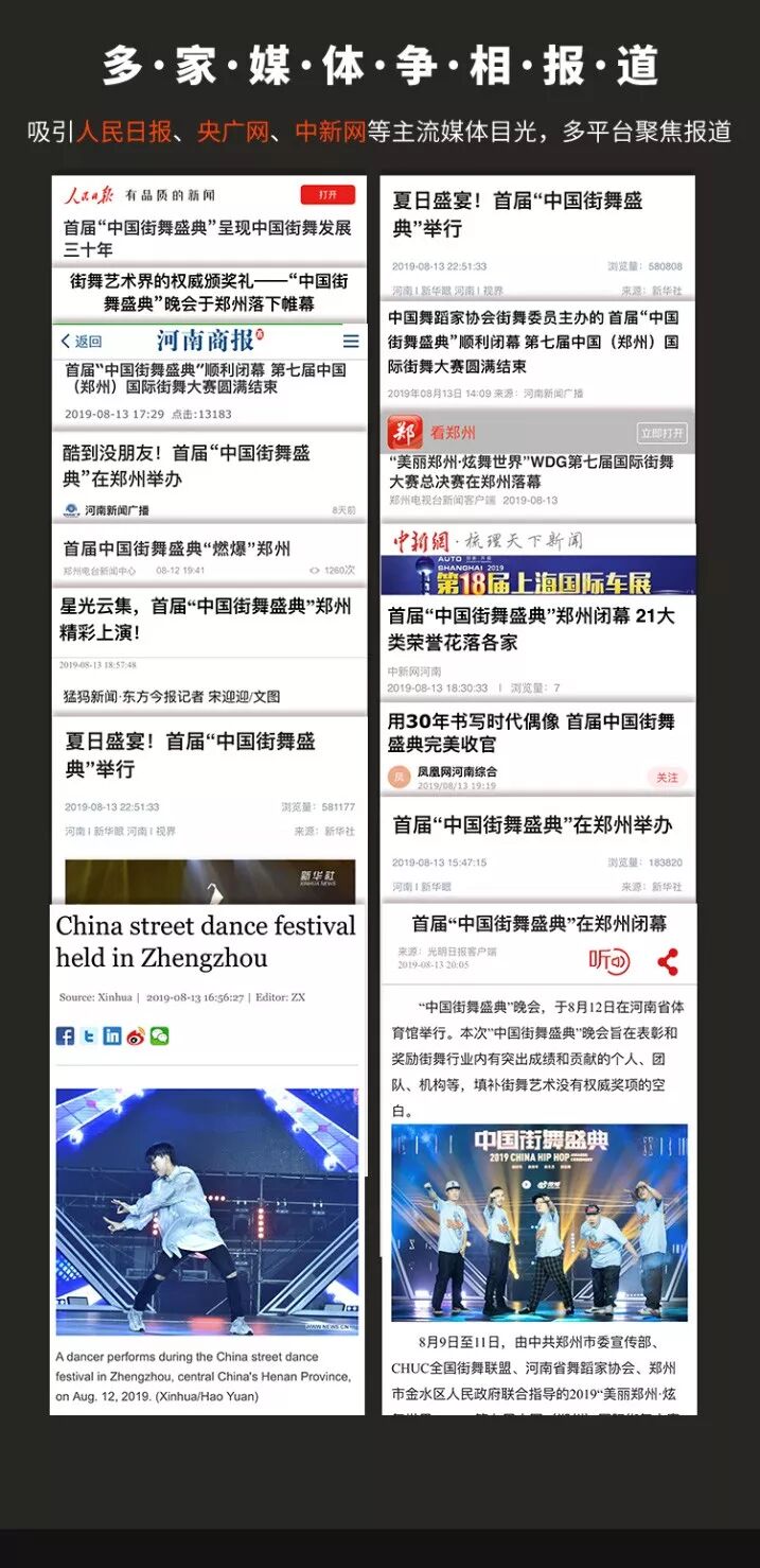 2019首届#中国街舞盛典#相关话题阅读量10.6亿+、视频播放量1.6亿+、博文发布量154万+、产生互动量489万+!汇聚国内知名舞者/舞团/机构,行业领导、业界领袖等出席,多家主流媒体报道。打造成为国内顶级、国际一流的盛典!