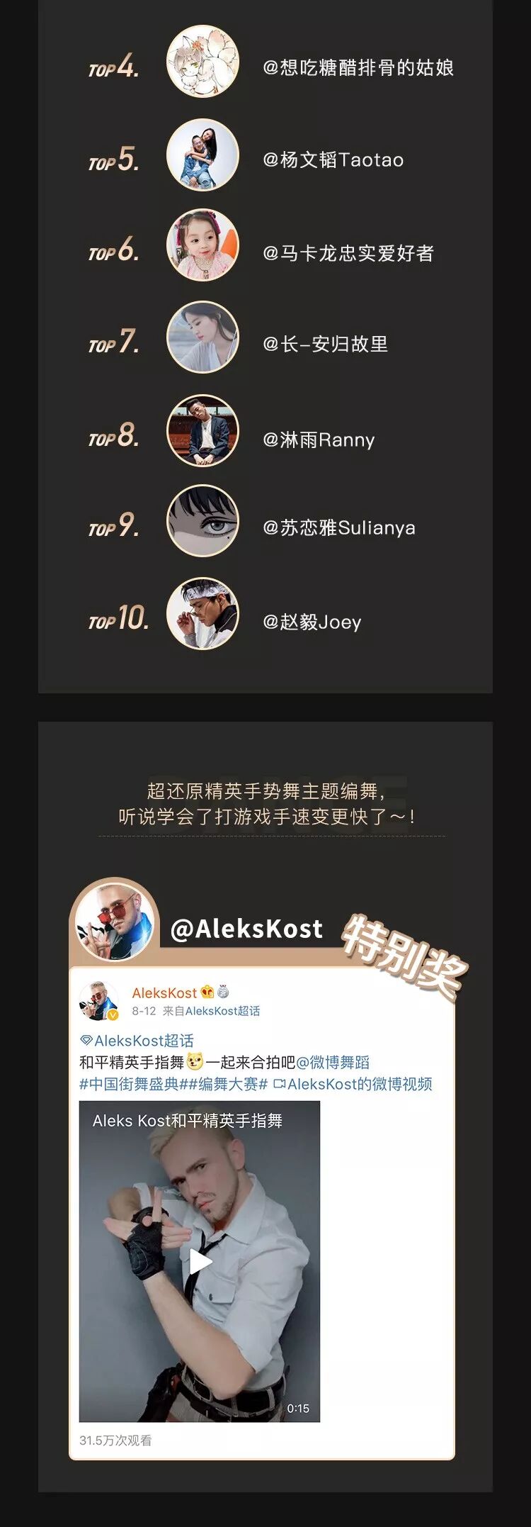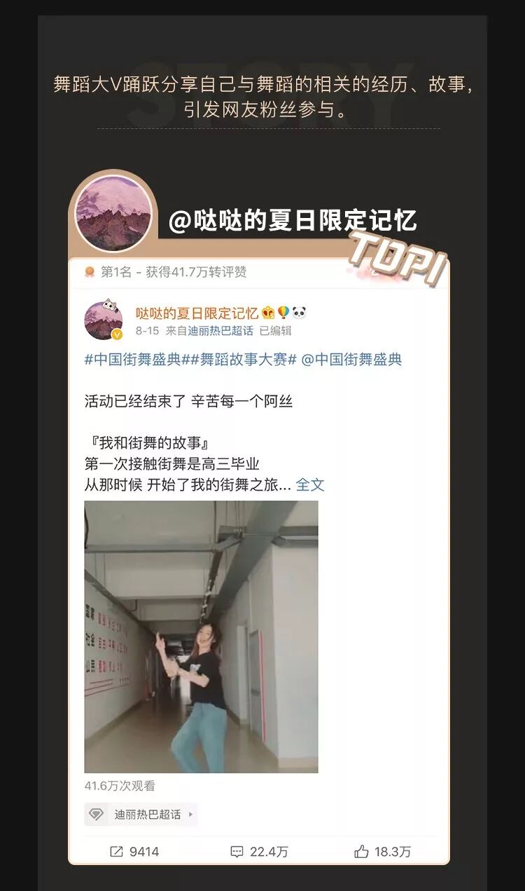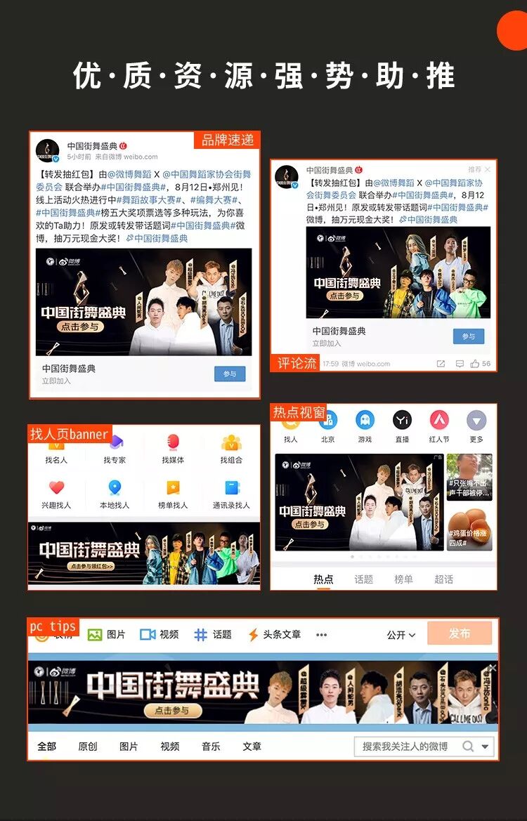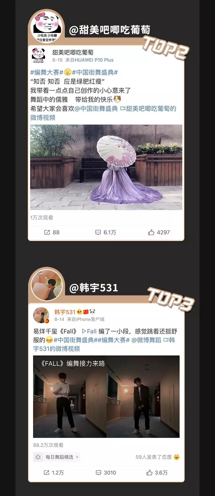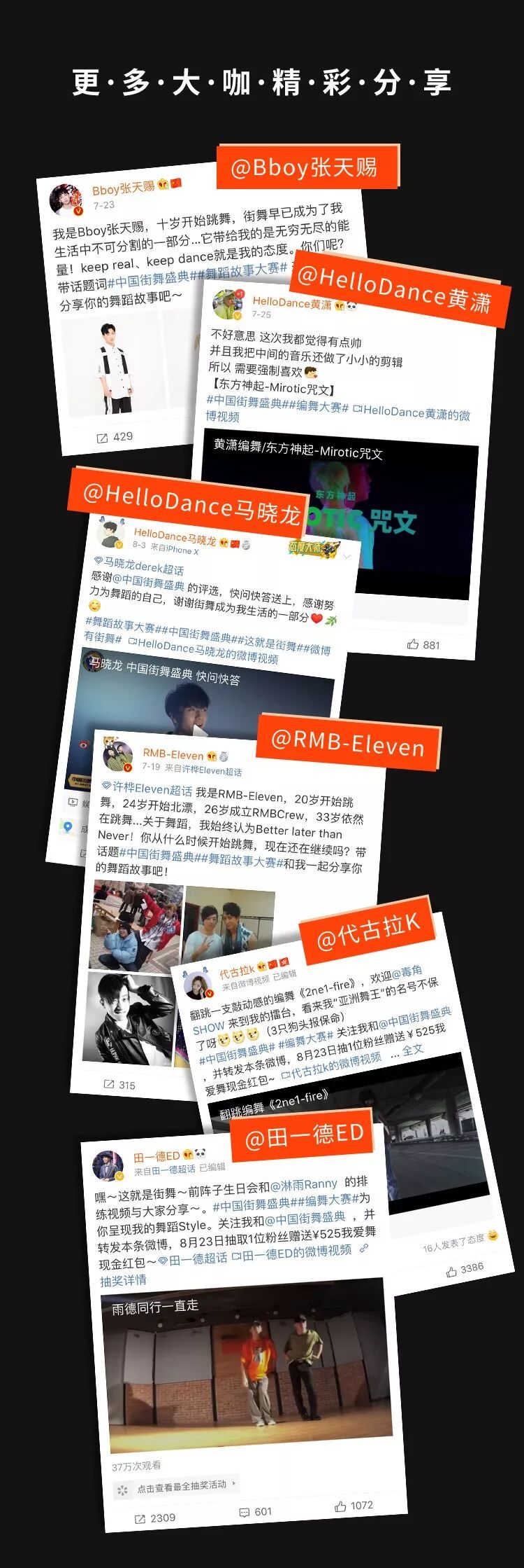 2019首届#中国街舞盛典#相关话题阅读量10.6亿+、视频播放量1.6亿+、博文发布量154万+、产生互动量489万+!汇聚国内知名舞者/舞团/机构,行业领导、业界领袖等出席,多家主流媒体报道。打造成为国内顶级、国际一流的盛典!
