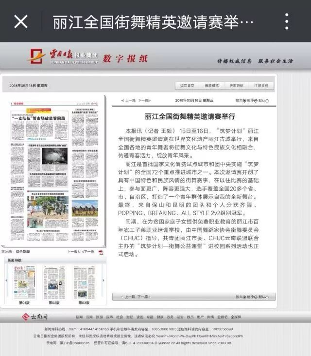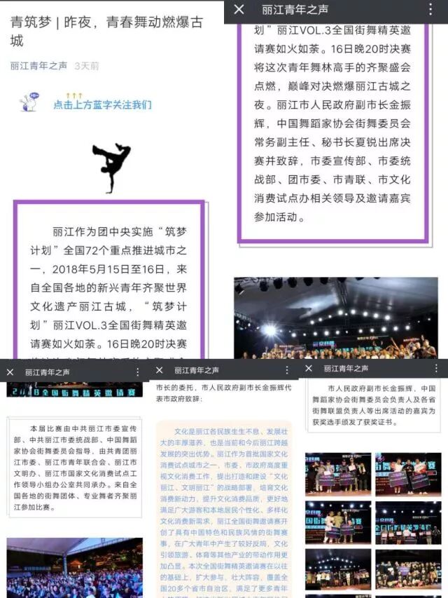 丽江是首批国家文化消费试点城市和团中央实施“筑梦计划”的全国72个重点推进城市之一,为具体落实共青团中央“筑梦计划”,5月15日至16日,由中国舞蹈家协会街舞委员会(CHUC)全国联盟、中共丽江市委统战部,丽江市委统战部指导,共青团丽江市委,丽江市青年联合会,丽江市文明办、丽江市国家文化消费试点工作领导小组办公室承办,丽江市外宣办、CHUC云南联盟协办的“筑梦计划”丽江全国街舞精英邀请赛在世界文化遗产丽江古城举行。